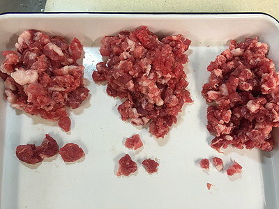 最左邊這個肉丁就是用最大洞那個絞出來的,肉的大小大概有1.5*1.5公分喔....