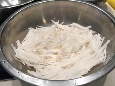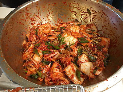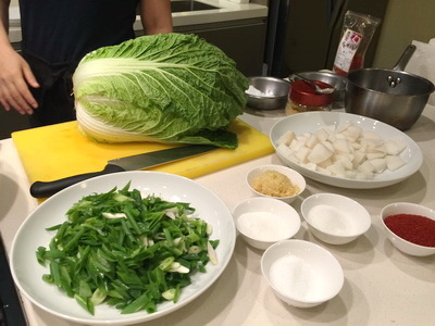 圖片上是已經撒鹽脫水完的泡菜,因為脫水需要時間,所以老師帶新鮮的大白菜和已經脫水完的泡菜來幫我們上課....