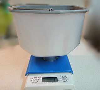 把麵包機攪拌缸整個放在秤上,所有的東西用一根湯匙就秤完了.....