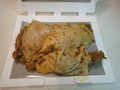 用 A Ling家的咖哩粉醃過的雞腿擺上去...
